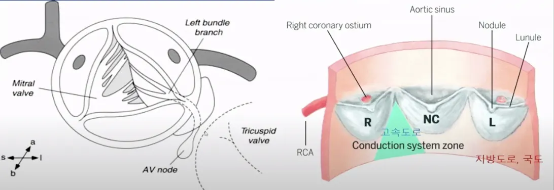 His bundle은 aorta의 벽을 따라 내려가는데, 왼쪽 심장에 가까이 있고,