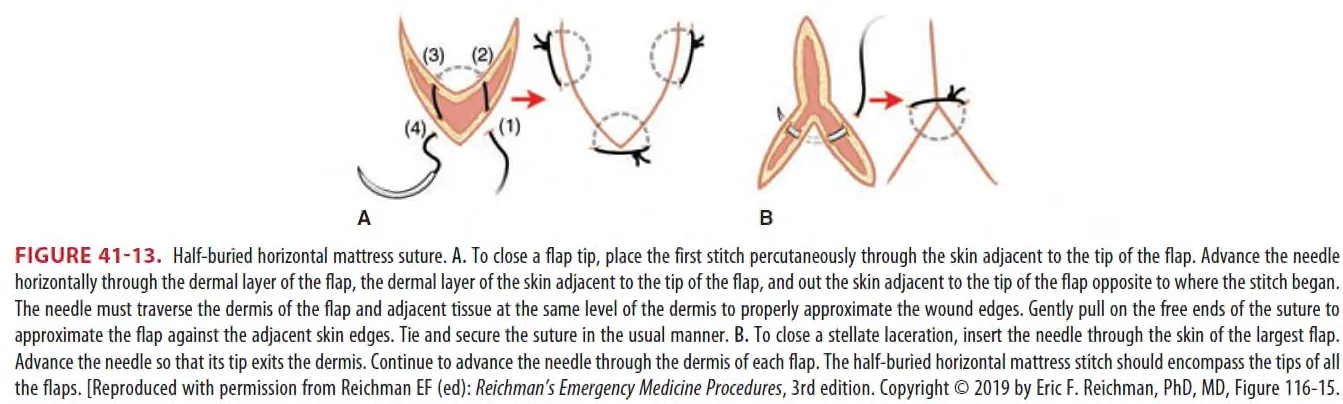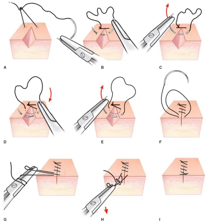 (4) 주로 corner stitches and flaps, stellate laceration 봉합에 이용함
