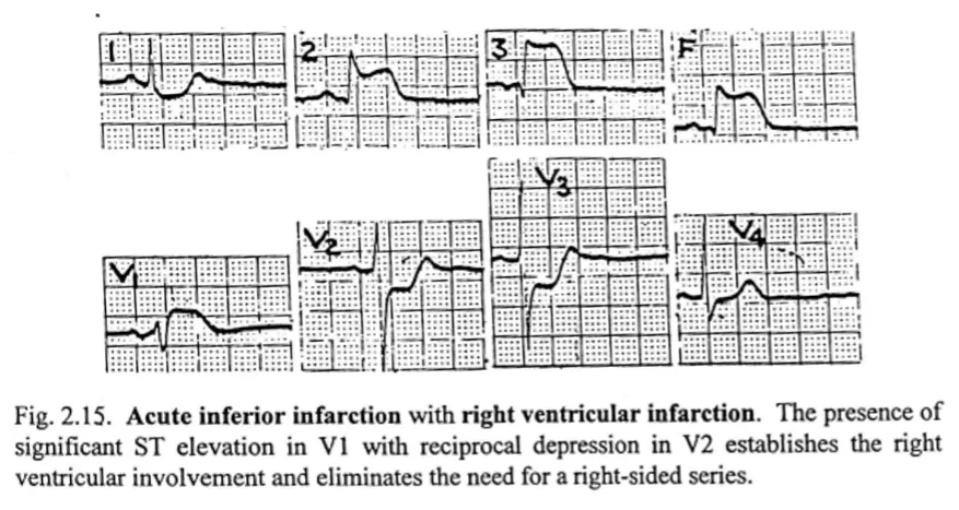 V1 ST elevation, V2 ST depression Rt. sided chest wall leads (V4R)