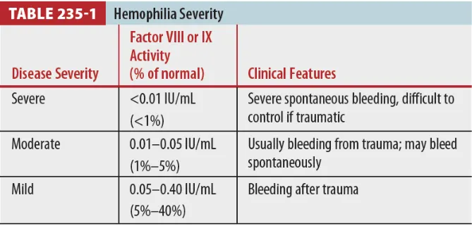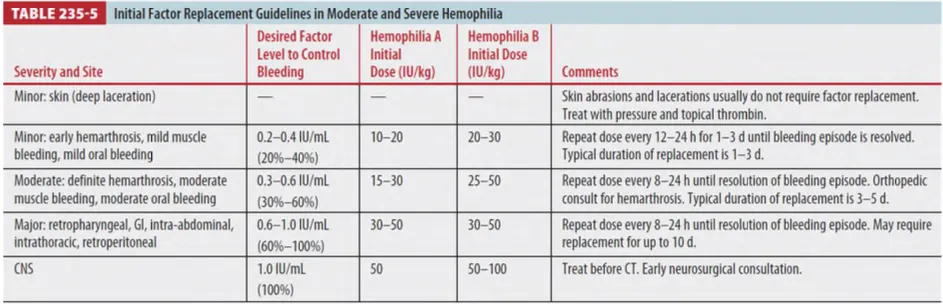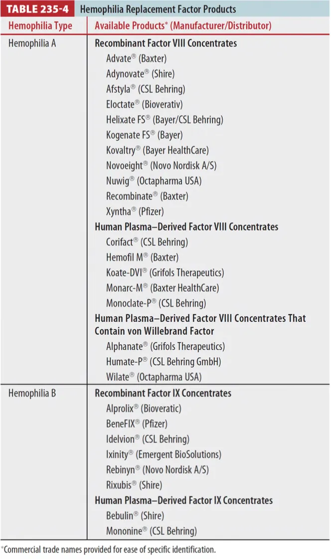 Factor 재료는 2가지 종류가 있다. (Table 235-4) 가능하면 환자가 사용하던 종류 factor를 써야 함.