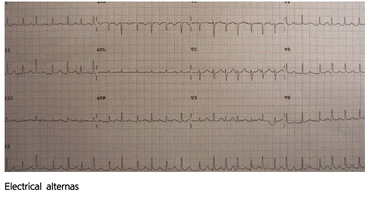 1 Low voltage QRS complex, Electrical alternans (Large amount)