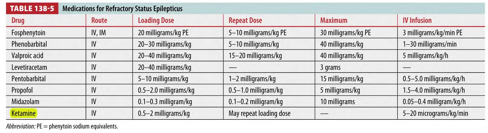 Table 138-5 summarizes the medications used for refractory status epilepticus (9th : Ketamine 추가 )