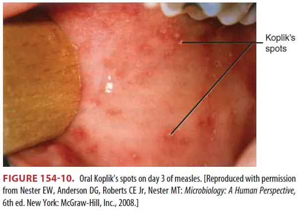 (1) Buccal mucosa에 작고 하얀 Koplik's spot이 초기에 보일 수 있고 이어서 red maculopapular