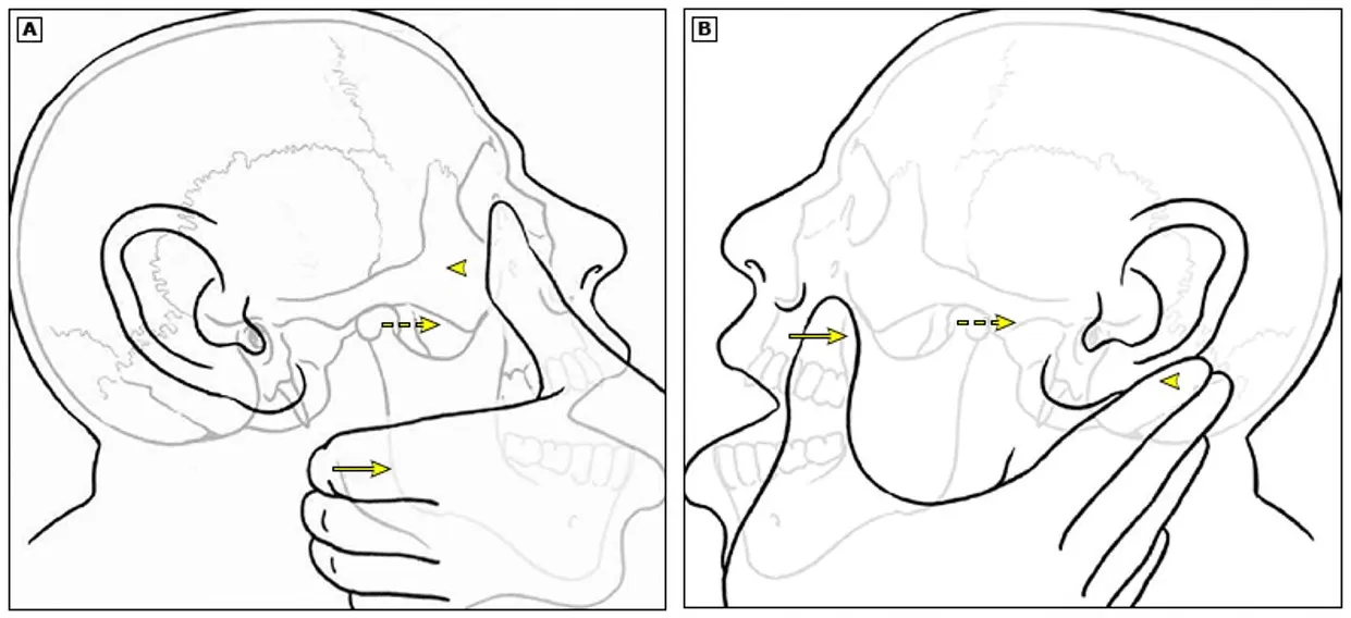 A : 얼굴의 한쪽면 ipsilateral TM joint의 anterior dislocation을 더욱 유발하고 턱을 돌려