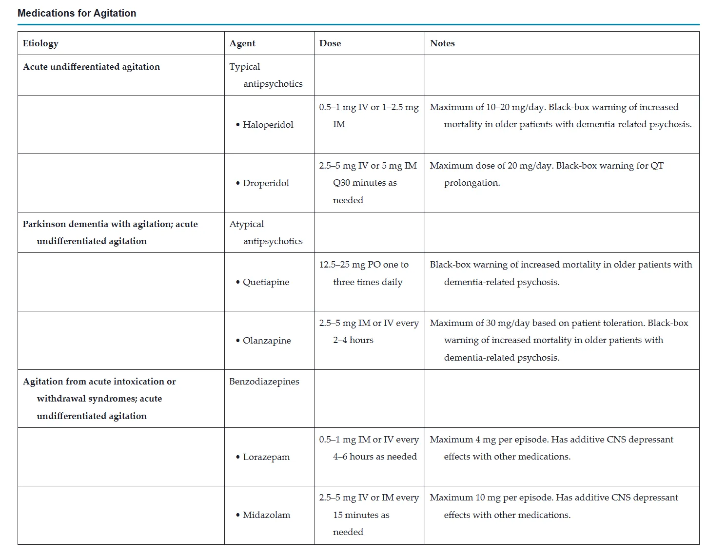신체적 억제 및 일부 약물은 agitation 악화 및 드물게 사망과 같은 부작용 위험이 있으므로 주의.