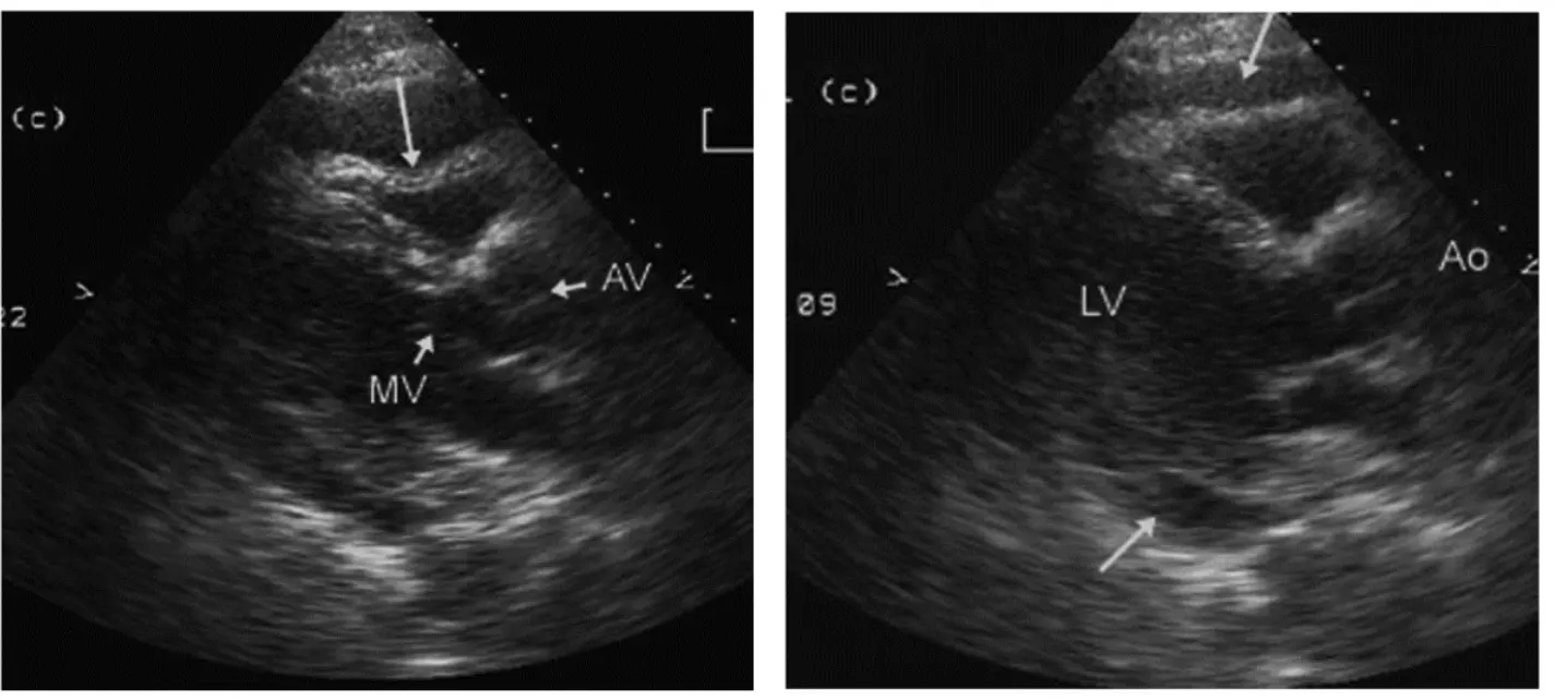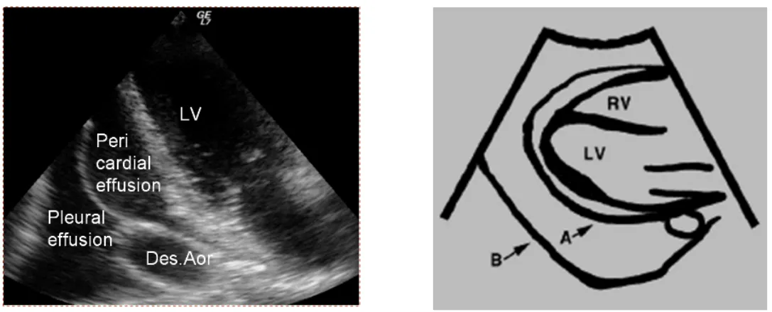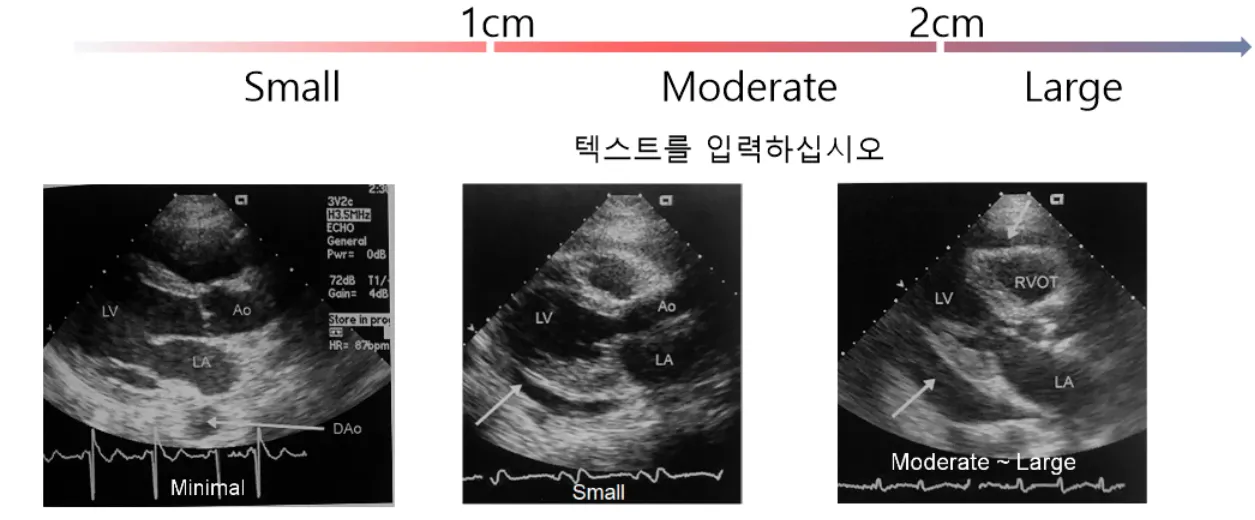 -> Aorta와 LV 사이에 나오는게 Pericardial effusion이고 그 뒤에 있는건 Pleural effusion.