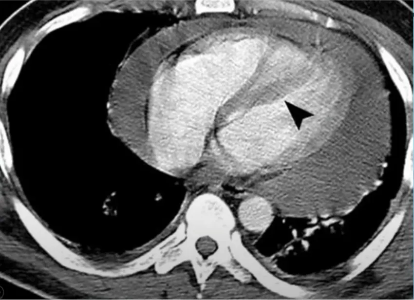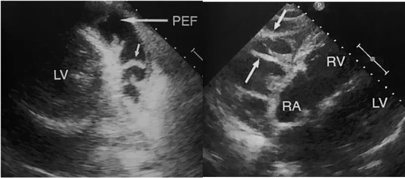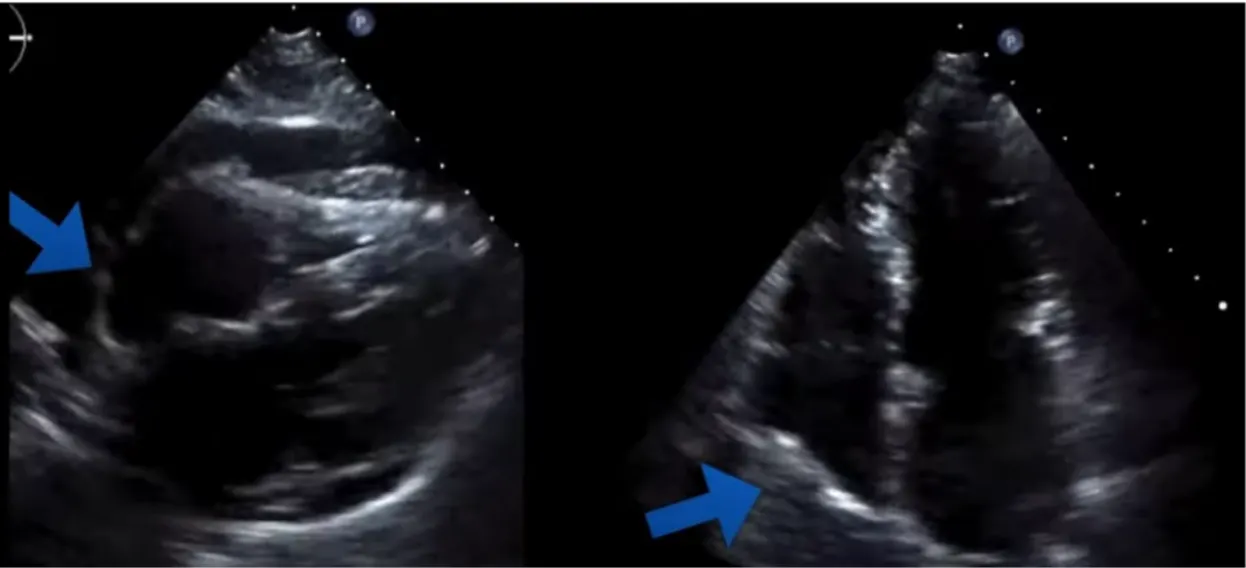 또한 epicardial fat pad도 감별. Fat pad는 주로 앞쪽에서만 보이고 effusion은 앞뒤로 둘러싸고 있음.