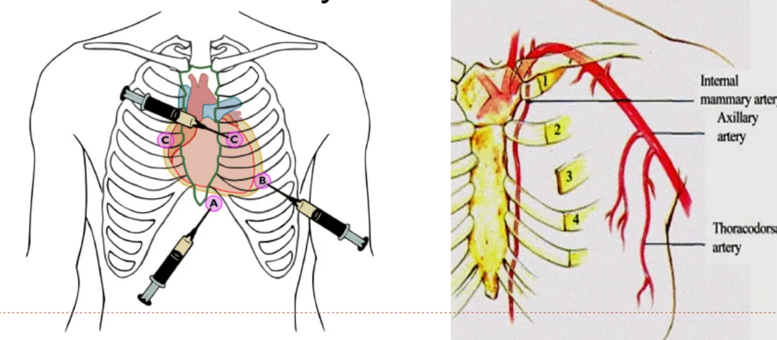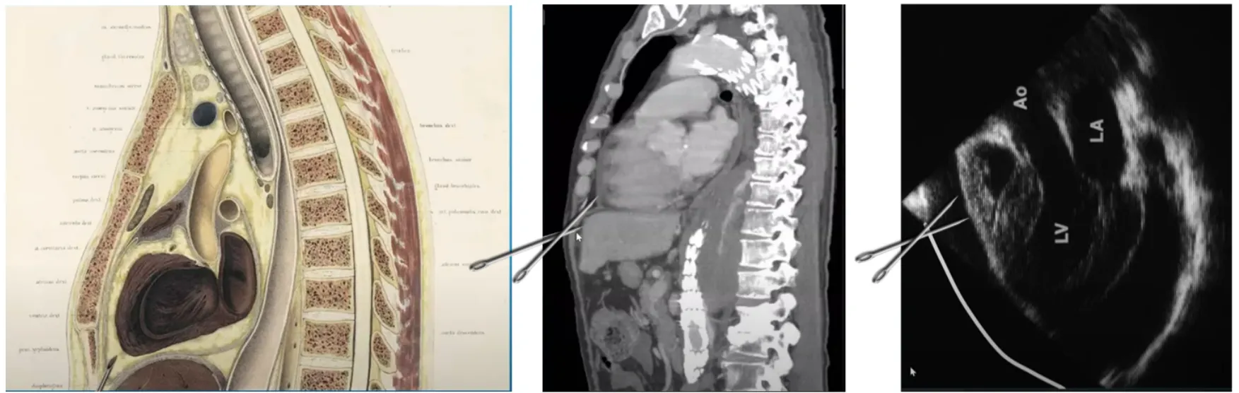 좀 더 superficial 한 각도, 적어도 45도~30도 각도로 넣어야 liver 찌르지 않고 pericardium 에 닿기 쉽다.