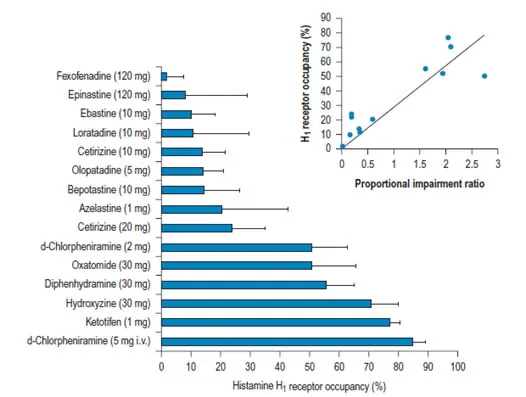 또한, 모든 1세대 약물은 표준용량을 투여하더라도 CNS에 영향을 미쳐 각성도 저하, 인지능·학습력·기억력 저하를 일으키며 피로, 졸음, 두통, 혼란, 행동변화(소아), 현기증이 나타날 수도 있다. CNS 이상반응은 CNS의 H1 수용체에 대한 약물의 점유율에 비례하여 나타나는데 약물 성분과 용량, 투여경로에 따라 달라진다. 연구결과, 1세대 약물인 chlor¬pheniramine, diphenhydramine, hydroxyzine, ketotifen, oxatomide의 CNS H1 수용체 점유율이 가장 큰 것으로 나타났다[그림1]. 1세대 약물 과용량 투여시 중증의 독성반응을 유발할 수 있으며, 적절한 처치를 하지 않을 경우 사망에 이를 수도 있다. 이러한 안전성 측면의 문제 때문에 알레르기질환 치료에 있어 1세대 항히스타민제는 더 이상 선택 약물이 아니다.