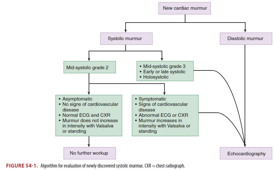 Diastolic murmur나 휴식 중 증상을 보이는 new systolic murmur의 경우 질병의 가능성을 고려하여 심초음파를 시행해야함