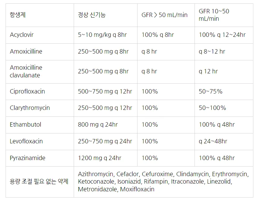 )은 48시간 간격으로 투여한다. 항결핵제 중 isoniazid, rifampicin은 용량 조절이 필요 없으며, ethambutol과 pyrazinamide는 GFR 30 mL/min 미만에서 투여 간격을 48시간으로 늘려야 한다.