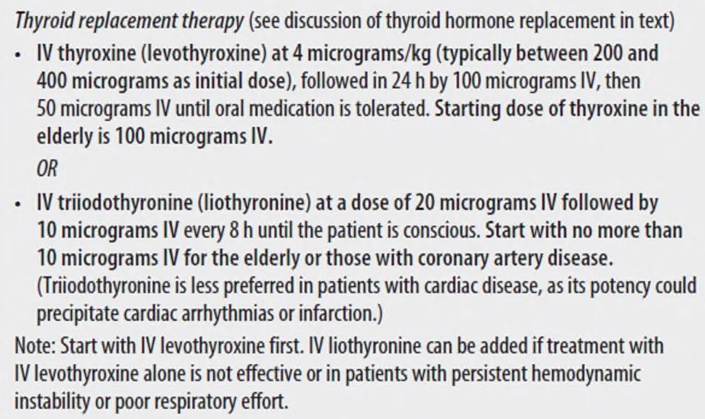 (1) Myxedema crisis 시 예후가 불량. 치료 필요 시 보통 치료 용량의 최고 반으로 시작.