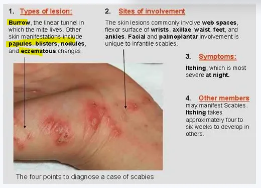 papules or vesicles in a typical distribution including the periumbilical area, inner thigh, buttock, axilla, inner forearm, (B) multiple nodules in genital area or axilla, (C) multiple papules, vesicles, or pustules in an infant; c)Light microscopy, dermoscopy, or other high-resolution imaging techniques including could be used; d)In general, apply on the whole body, except the face and scalp, at least 30 minutes after taking a shower. For treatment of infants and older adults, it should be applied to the