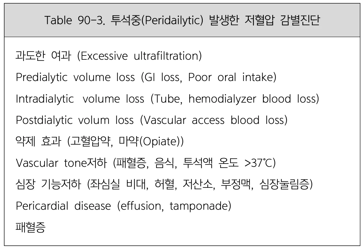 투석 도중 발생한 저혈압은 건체중을 적게 측정해 발생하는 과도한 여과(excesstive ulgrafiltration)에 의한 것이 가장 흔하다.