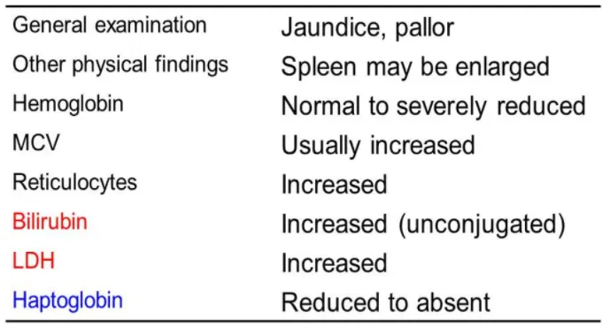 → unconjugated bilirubin ↑, LDH↑, haptoglobin ↓, serum iron↑