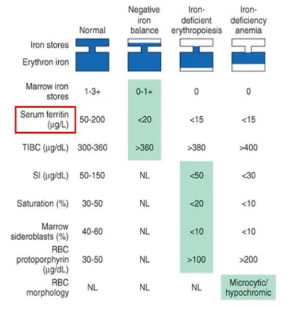 Transferrin saturation | <10% | <10~20% | 10~20% | 30~80% | 30-80% |