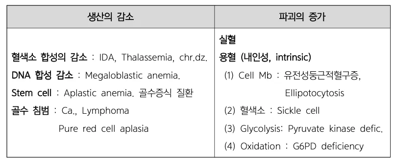 빈혈의 종류: 생산 감소, 파괴 증가, 불량품 생산