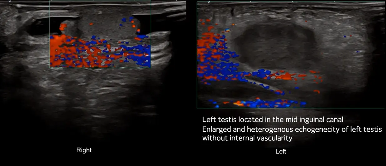 enlarged testis, decreased or absent flow