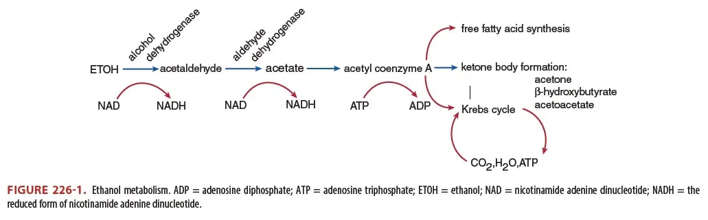 에탄올은 alcohol dehydrogenase, aldehyde dehydrogenase, NAD등을 이용하여