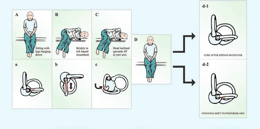 Appiani maneuver는 이석을 anterior limb에서 posterior limb로 이동시키거나 utricle로 배출시키는 목적. 수행 후 geotropic variant로 전환될 수 있으며, 이 경우에는 Gufoni 또는 Barbecue maneuver로 전환 진행함.