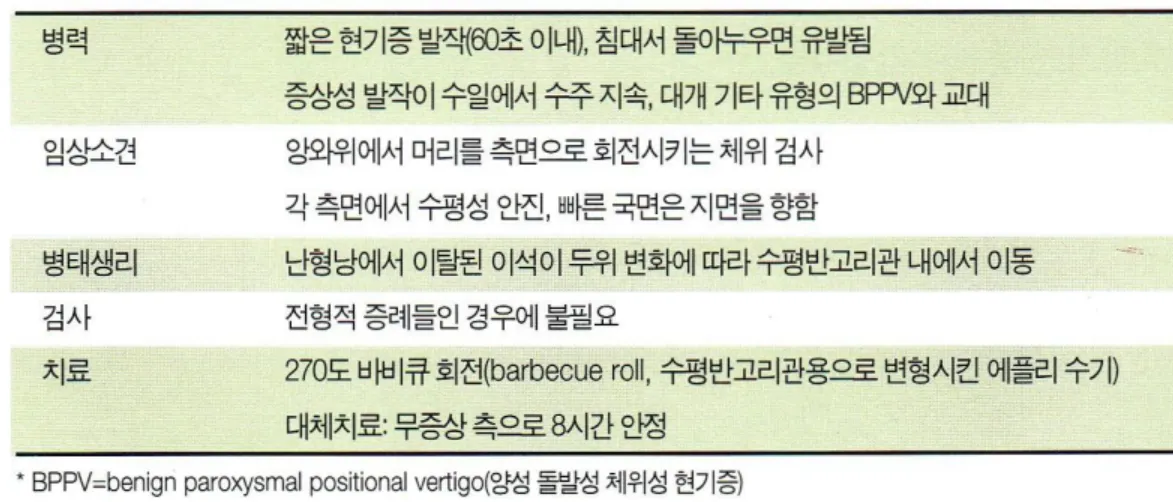 Posterior limb | Geotropic | Gufoni, Barbecue roll | 가장 흔함, 치료 반응 좋음 |
