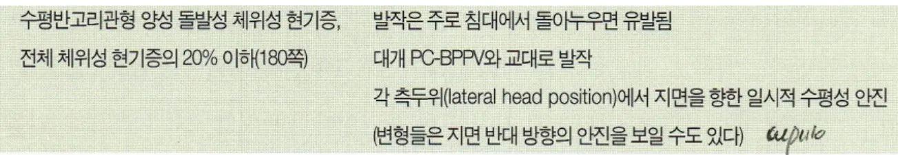 환자는 누울 때나 옆으로 돌아눕는 등 머리 위치 변화 시 심한 어지러움과 함께, roll test에서 병변 쪽을 아래로 할 때 강한 geotropic 수평 안진이 나타남.