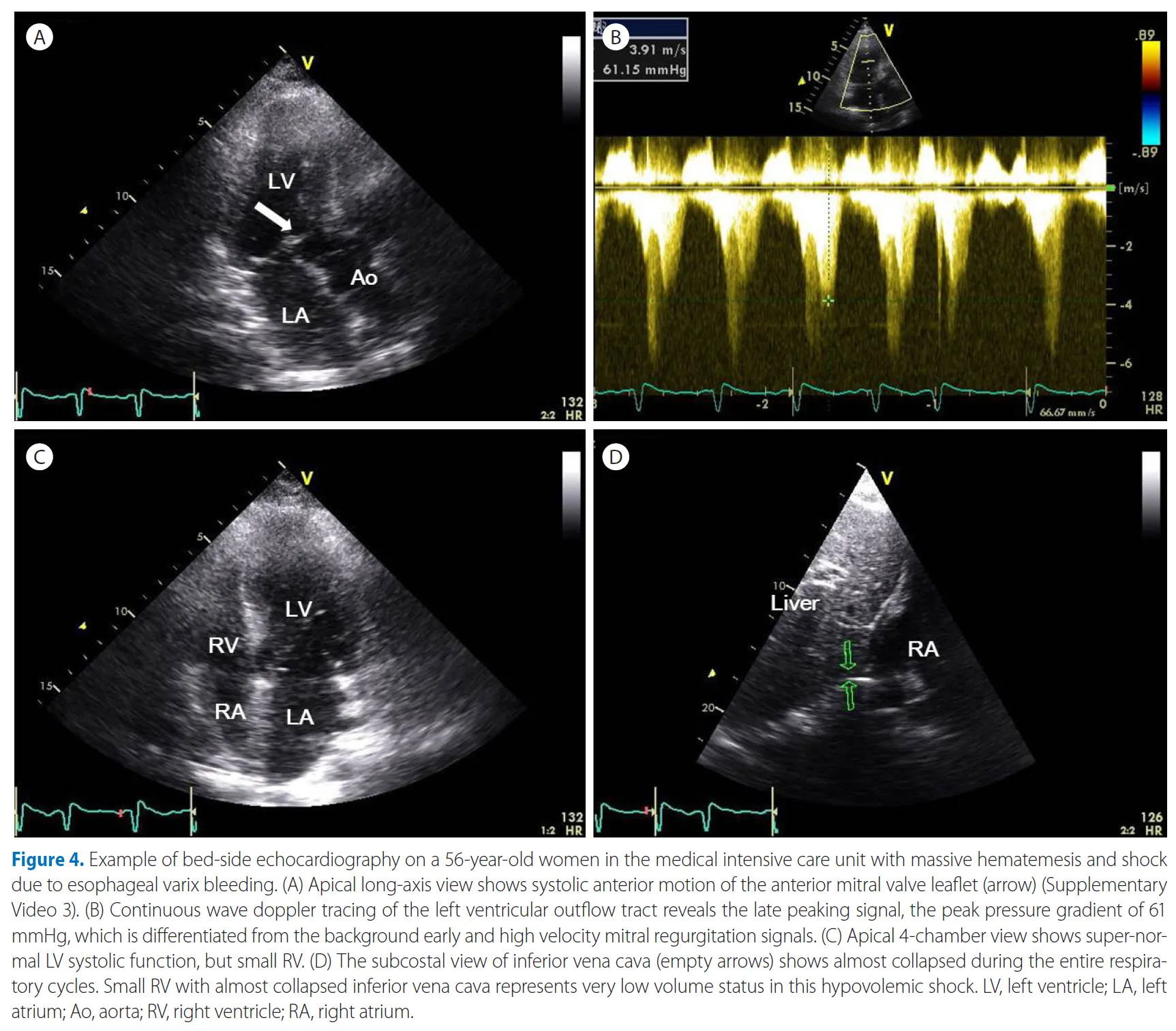 식도 정맥류 출혈로 인해. (A) APLX view는 전방 승모판 전단(화살표)의 수축기 전방 운동을 보여줍니다. (B) 좌심실 유출로의 CW 도플러 추적은 Late peaking signal, 즉 최고 압력 구배 61 mmHg로, 배경의 초기 및 고속 승모판 역류 신호와 구별됩니다. (C) AP4C view는 super-normal LV systolic function 을 보여주지만, RV는 작다. (D) 하대정맥의 늑골 하보기 (빈 화살표)는 전체 호흡기 동안 거의 붕괴 된 것을 보여줍니다. 거의 collape된 IVC와 작은 RV는 이 저혈량성 쇼크에서 매우 낮은 체적 상태를 나타냅니다.