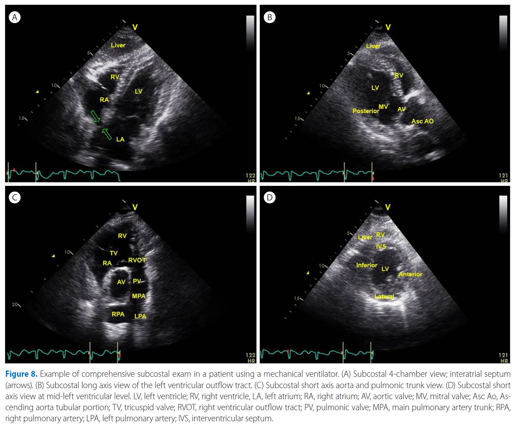 심장이 아래로 밀려, Subcostal view를 이용하면 좋은 영상을 얻을 수 있다.