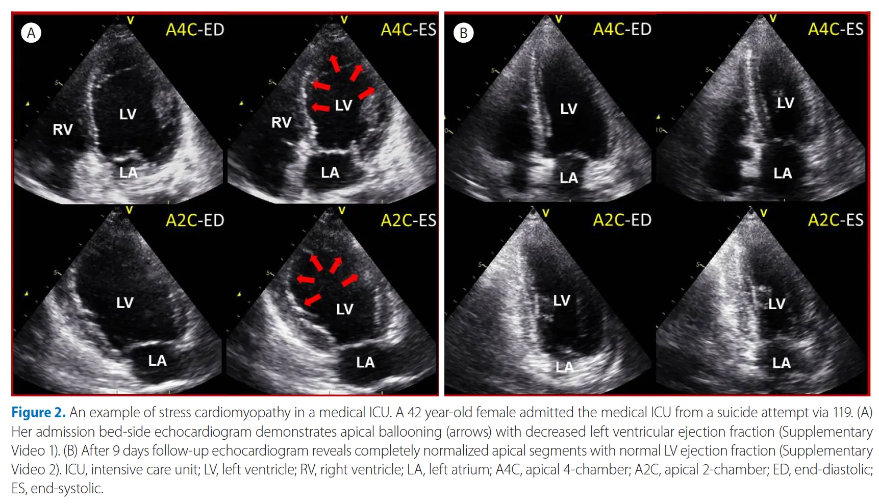 일차적으로 EF가 좋고 국소벽 운동장애가 없으면 심장이 일차적인 원인이 아닐 것이라 생각할 수 있지만, 드물게 급성 승모판막 역류와 같은 환자에서는 super LV EF를 가진 급성 폐부종으로 나타날 수 있으므로, 순서를 가지고 2D 및 doppler를 통해 서 전반적으로 심장의 기본적인 구조와 기능을 평가해야 한다.