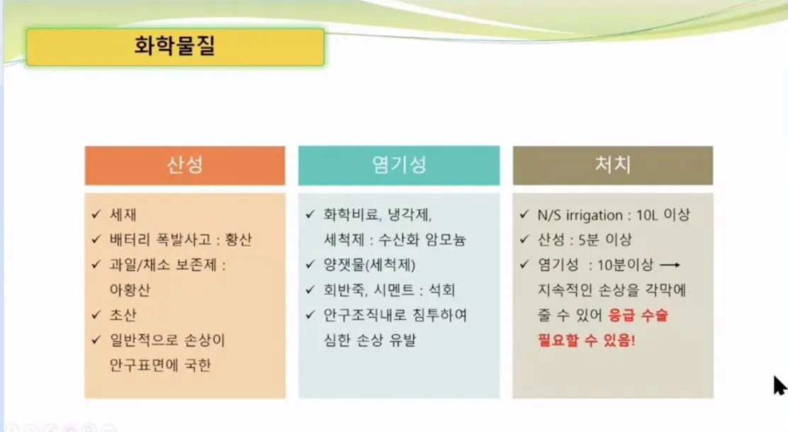 : pH <12인 알칼리 물질 or pH >2인 산성 물질은 심각한 손상을 유발하지 않는 것으로 생각되나