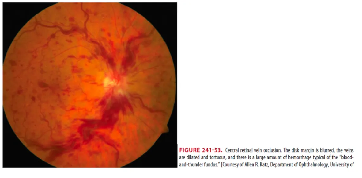 : 'blood-and-thunder fundus' (모든 사분면에 생기는 diffuse retinal hemorrhage)