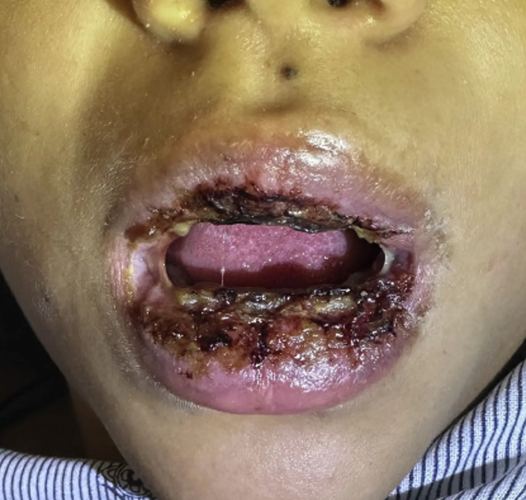 마이코플라스마 뉴모니아는 어린이 상기도 및 하기도 감염의 빈번한 원인이며 학령기 어린이와 청소년 폐렴의 주요 원인입니다[1]. 감염은 일반적으로 경미하고 자가 제한적이지만 경우에 따라 스티븐스존슨증후군과 독성 표피 괴사증을 모방할 수 있는 중증 점막염이 발생할 수 있습니다. 한때 마이코플라즈마 유발 발진 및 점막염(MIRM)으로 분류되었던 이 질환은 다른 감염원이 이 질환을 유발할 수 있기 때문에 현재 반응성 감염성 점막 피부 발진(RIME)으로 알려져 있습니다. RIME은 주로 약물로 인한 유발 요인보다는 호흡기 감염 후 어린이와 청소년에서 발생하며, 마이코플라스마 뉴모니아에 감염이 이 중증 점막 피부 증후군의 주요 원인으로 지목되고 있습니다[2]. 입술의 출혈성 딱지와 혀의 미란이 가장 흔합니다[3,4]. 안구 침범이 있는 환자는 종종 화농성 양측 눈 분비물, 광 공포증, 눈꺼풀 부종이 있습니다[3,4]. 비뇨생식기 병변이 발견될 수 있습니다. 피부 병변은 일반적으로 드물고 흔하지 않지만 몸통, 사지, 때때로 얼굴에서 발견될 수 있습니다. 지지적 치료 외에도 마크로라이드 항생제, 전신 코르티코스테로이드, 면역 조절 치료가 필요할 수 있지만 스티븐스-존슨 증후군 및 독성 표피 괴사에 비해 예후가 양호하고 전반적인 사망률이 낮습니다[4].