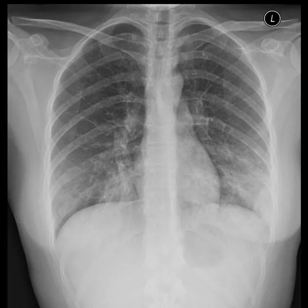CXR에서도 앉아있거나 서있던 사람의 경우에는 우하엽 haziness가 가장 흔히 보임