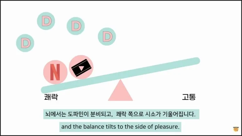 유튜브 보는 게 좋은 게 아님 - 도파민을 많이 분출 시키는데, 도파민 수용체의 반응성이 떨어져서 즐거움이 떨어진다. 실제로는 쉬지 않는 것이다.