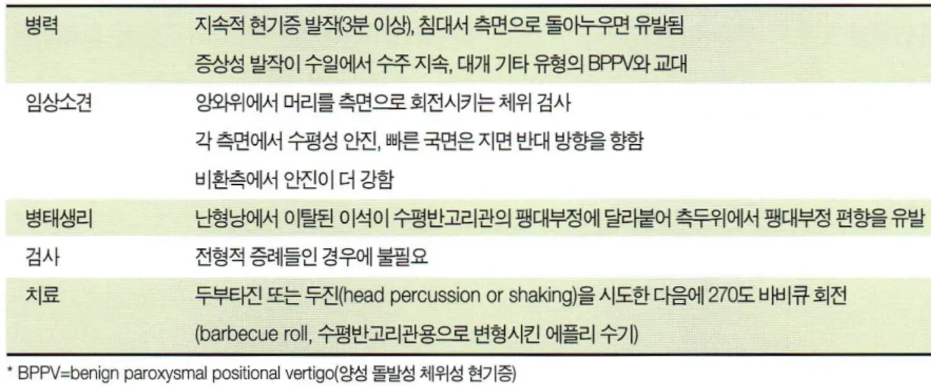 구분 | 안진 방향 | 지속 시간 | 피로성 | 병변 쪽 머리 회전시 안진 | 치료 반응 |
