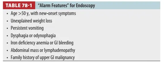 진단되지 않은 소화 불량 환자 모두에게 내시경이 필요한 것은 아니나 alarm features (Table 78-1)