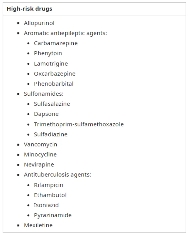Severe drug adverse reaction (주로 약 먹고 8주 이내 발생 / 항경련제, 알로푸리놀, 설파제 등등)