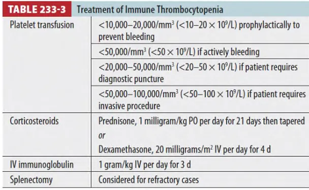 대량 출혈의 경우 지혈과 함께 IV corticosteroids, immunoglobulin 및 2~3배 용량의 혈소판 수혈 치료를 동시에 한다.