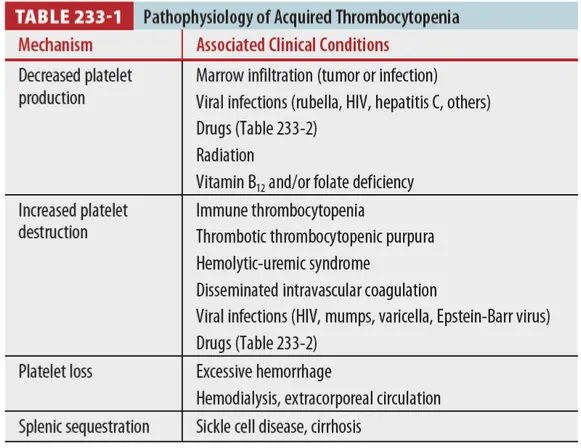 Platelet 수 감소는 mechanism이 불분명하며 여러 원인이 있다 (Table 233-1)