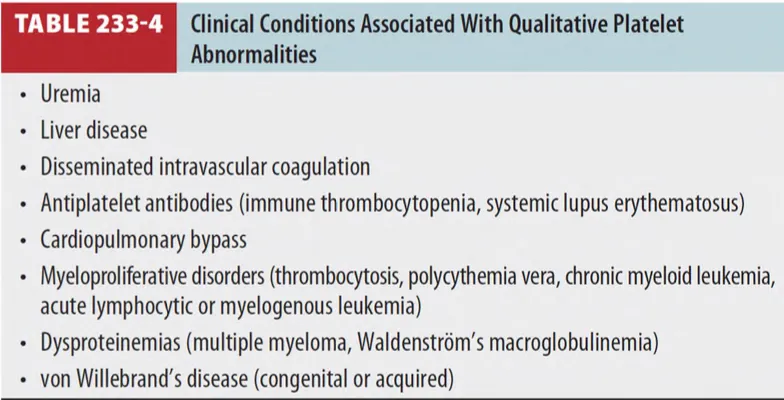 (1) 여러 질환에서 PLT 기능 저하가 나타난다. (Table 233-4)