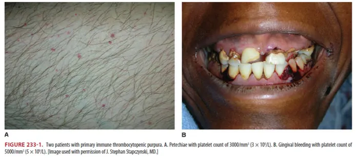 증상 : Petechial rash, Mild epistaxis, Gingival bleeding, Menorrhagia (Fig 233-1)