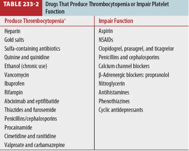 많은 약제에서 PLT 감소 혹은 기능 저하를 유발하므로 drug Hx가 중요 (Table 233-2)