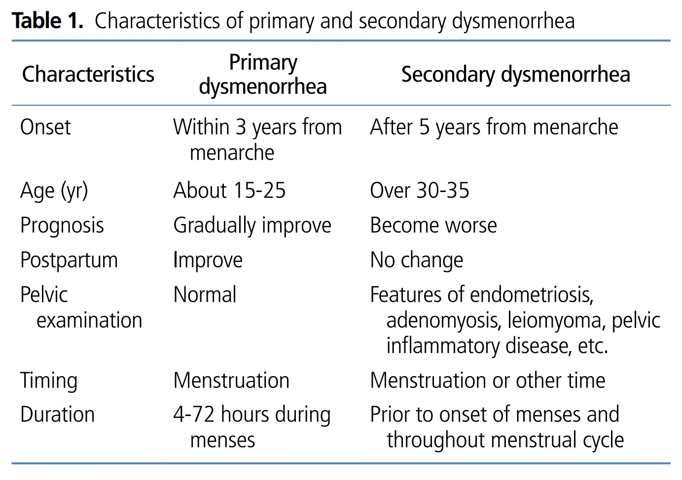 일차성 생리통과 이차성 생리통의 차이 ( 실제 진료에 있어서는 둘 사이의 구분이 명확하지 않은 경우도 있음을 주지해야 한다)