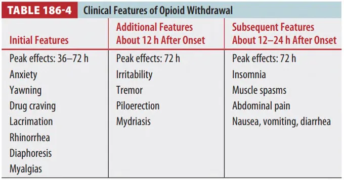 (1) 6~12시간 뒤 불안/하품/drug craving → Tremor, 발기, 근연축, 소화기증상