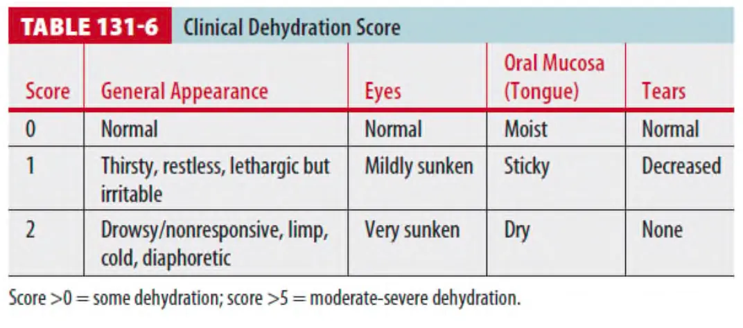 * Table 131-6에는 탈수에 대한 간단한 scoring system이 나와 있다.