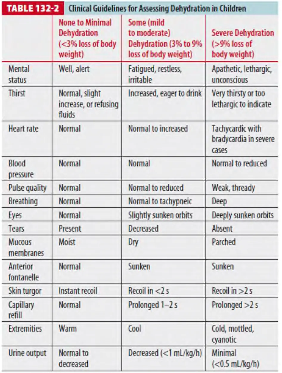 Table 132-2에 탈수의 흔한 증상 및 증후가 나와 있다.