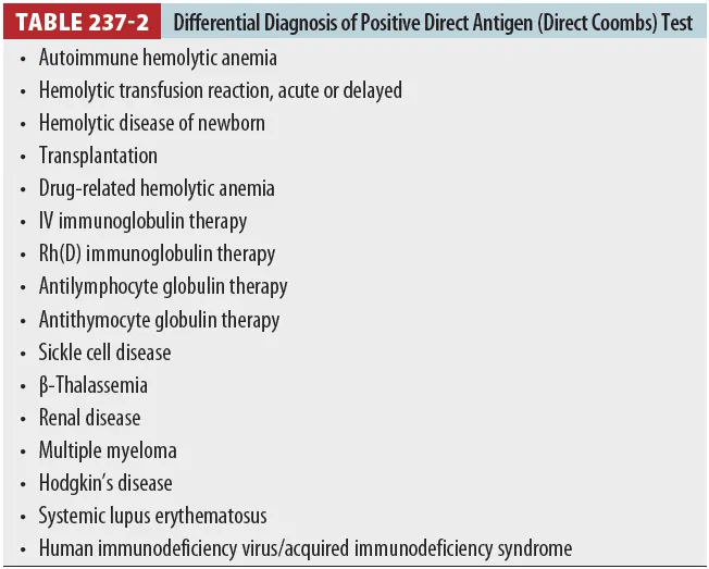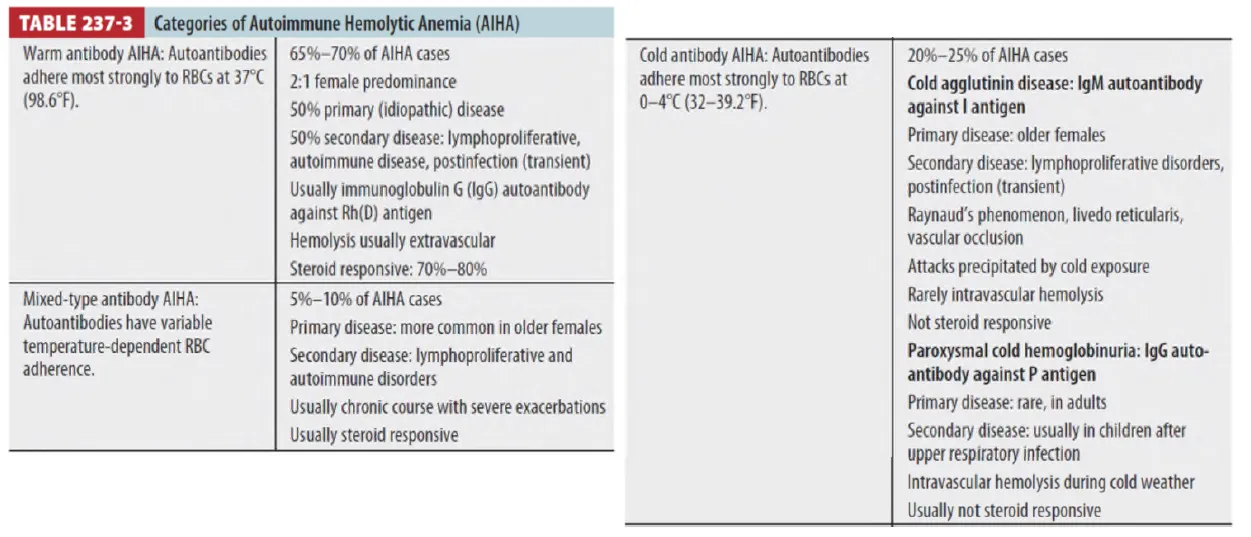 : AIHA의 autoantibody type별 category - warm, cold, mixed type (Table 237-3)