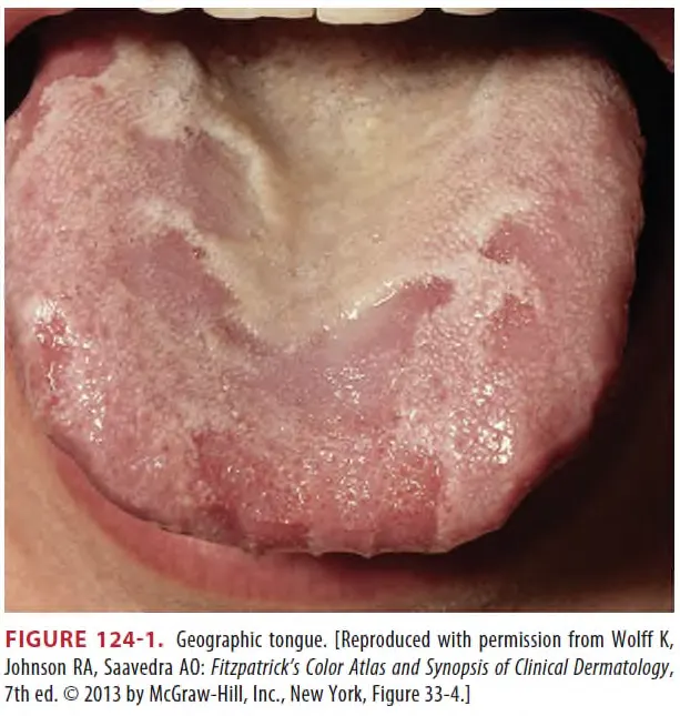 (2) Erythema and atrophy of the papillae of the tongue surrounded by a serpiginous,