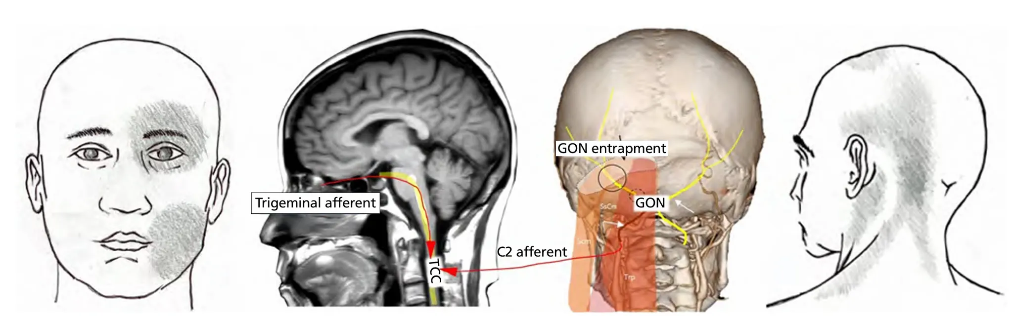 후두 및 목 부위의 통각 구심성 신호는 고경추(C1~C3) 신경근을 통해 C2 후근에 위치한 **삼차경추복합체(TCC, trigeminocervical complex)**로 전달됩니다.