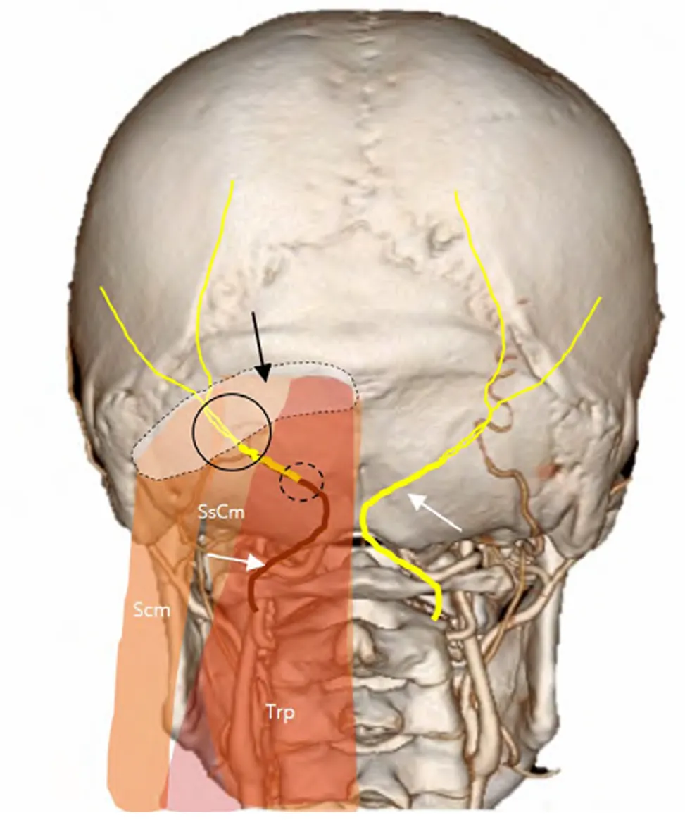 이 신경은 **머리반가시근(semispinalis capitis muscle)**을 통과하며 상승하고, 머리 피부로 나오기 전에 **승모근(trapezius)**과 흉쇄유돌근(sternocleidomastoid muscle) 사이의 건막 슬링(aponeurotic sling)(검은색 화살표)을 관통하여 상항선(superior nuchal line) 근처에서 두근 부착부로 진행합니다. 이 통로(승모근 터널, trapezial tunnel, 검은색 원으로 표시)는 GON이 압박될 수 있는 부위입니다.
